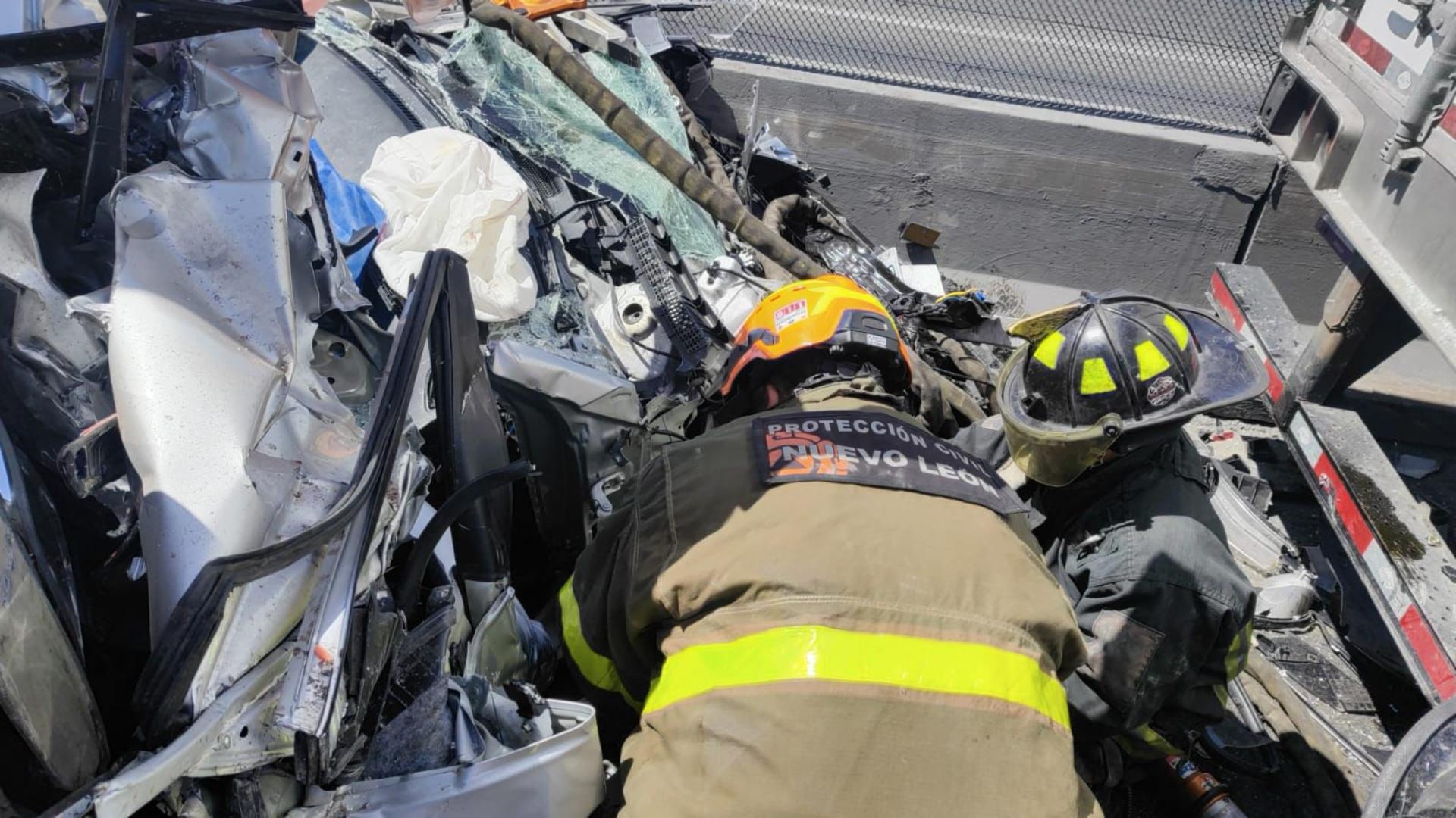 Elementos de Protección Civil de Nuevo León acudieron rápidamente al sitio para coordinar las maniobras de auxilio con el personal municipal de la zona. La magnitud del impacto fue tal que el vehículo compacto quedó totalmente destrozado entre los fierros de las pesadas unidades de carga involucradas.