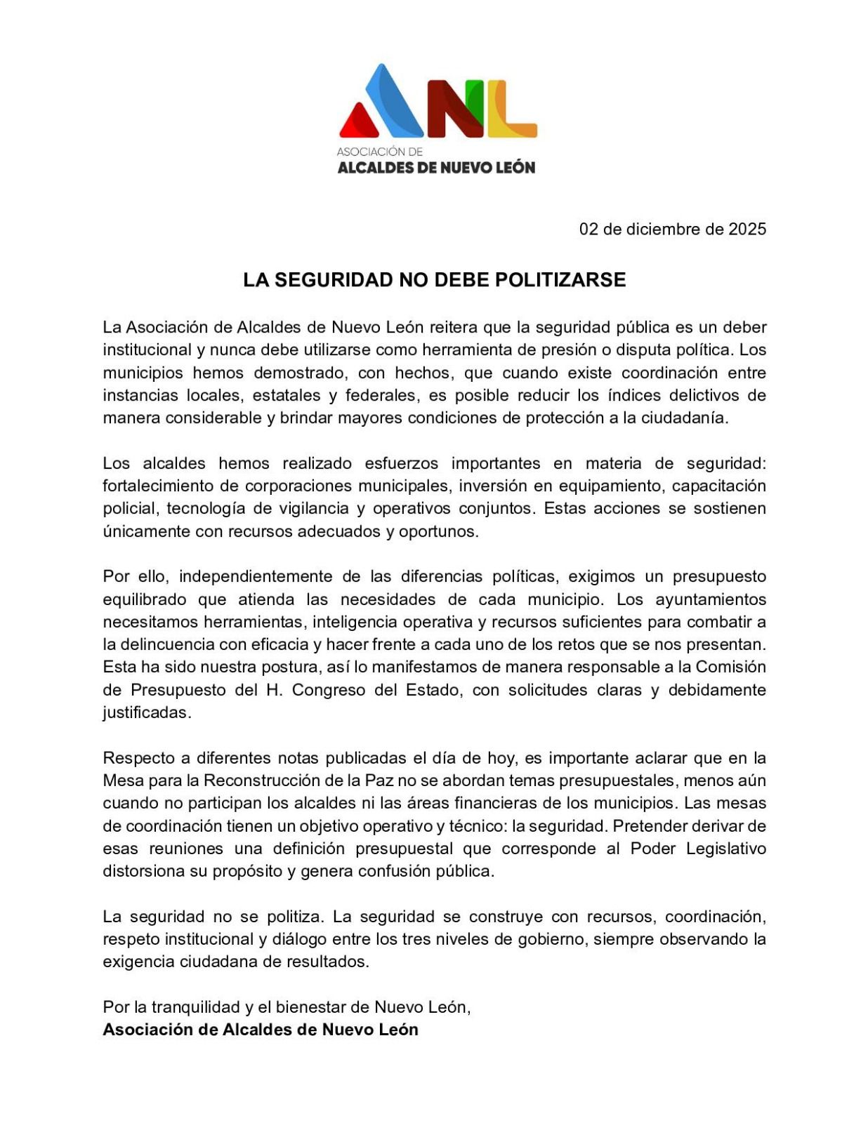 La Asociación de Alcaldes de Nuevo León —conformada por representantes de distintas fuerzas políticas— emitió un comunicado donde reiteró que la seguridad debe mantenerse como una responsabilidad institucional.
