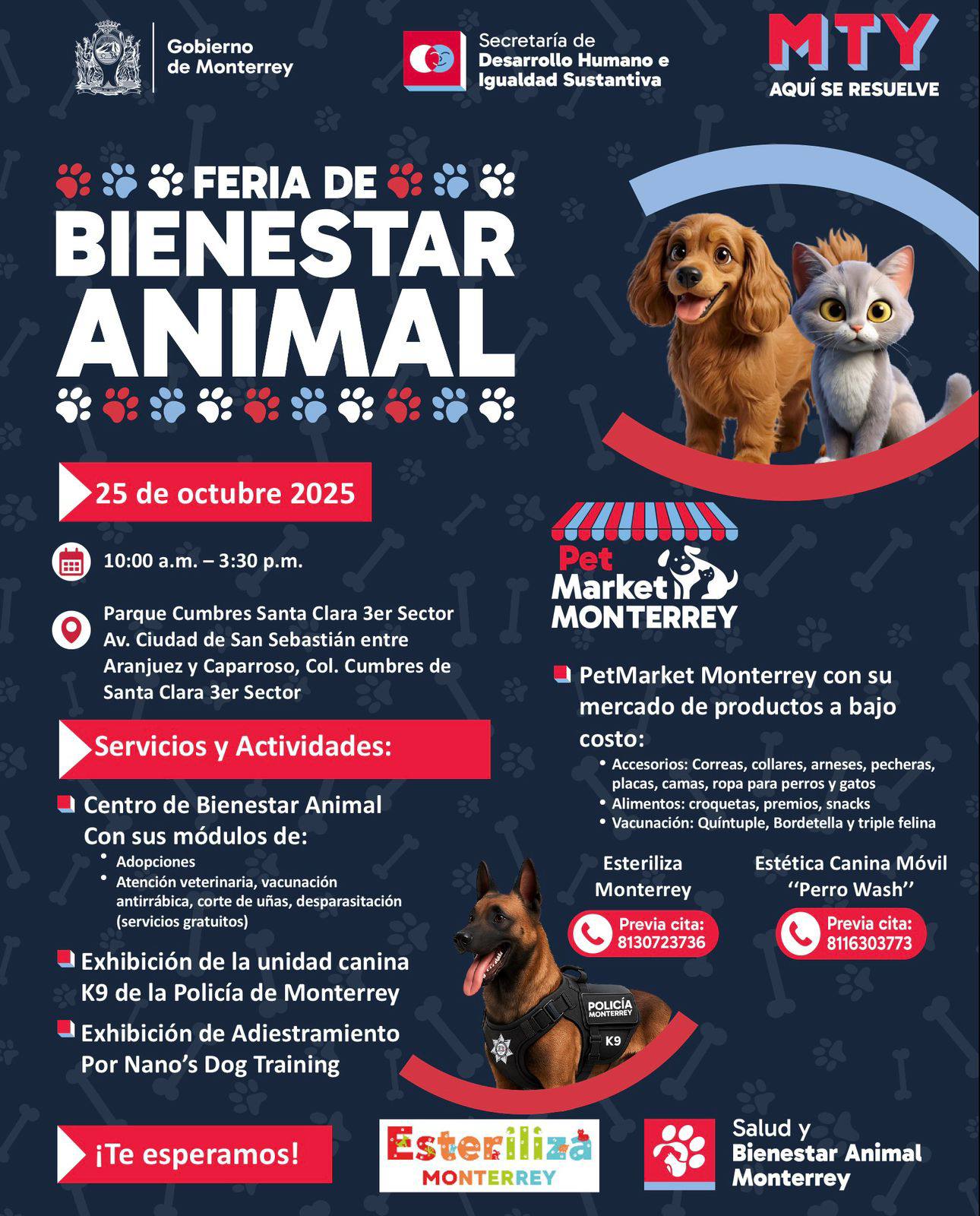 Además de los servicios médicos y de adopción, el evento contará con una exhibición de la unidad canina K9 de la Policía de Monterrey, quienes realizarán una demostración sobre su entrenamiento y funciones en materia de seguridad y rescate.